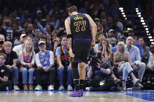 4月初,湖人官方宣布,东契奇因左腿筋二级拉伤无限期缺阵。