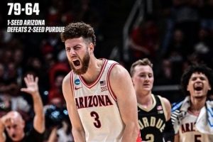 体育资讯3月29日讯 今天结束的一场NCAA锦标赛8强战,亚利桑那大学79比64击败普渡大学,晋级4强。