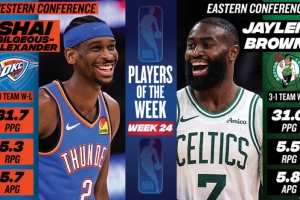 体育资讯4月7日讯 NBA官方公布了25-26赛季第24周的东西部周最佳球员,杰伦·布朗和亚历山大当选。