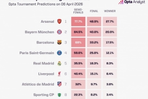 Opta预测晋级欧冠四强概率:枪手77.7%最高,巴萨68%、拜仁64.5%