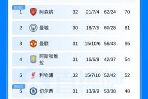 英超积分榜:红军先赛4分领先第6切尔西,枪手输球切尔西将战曼城